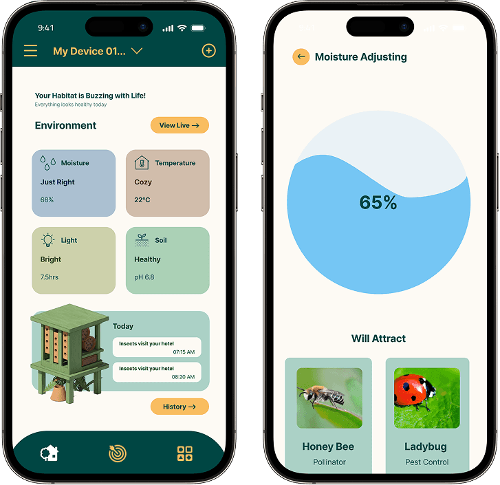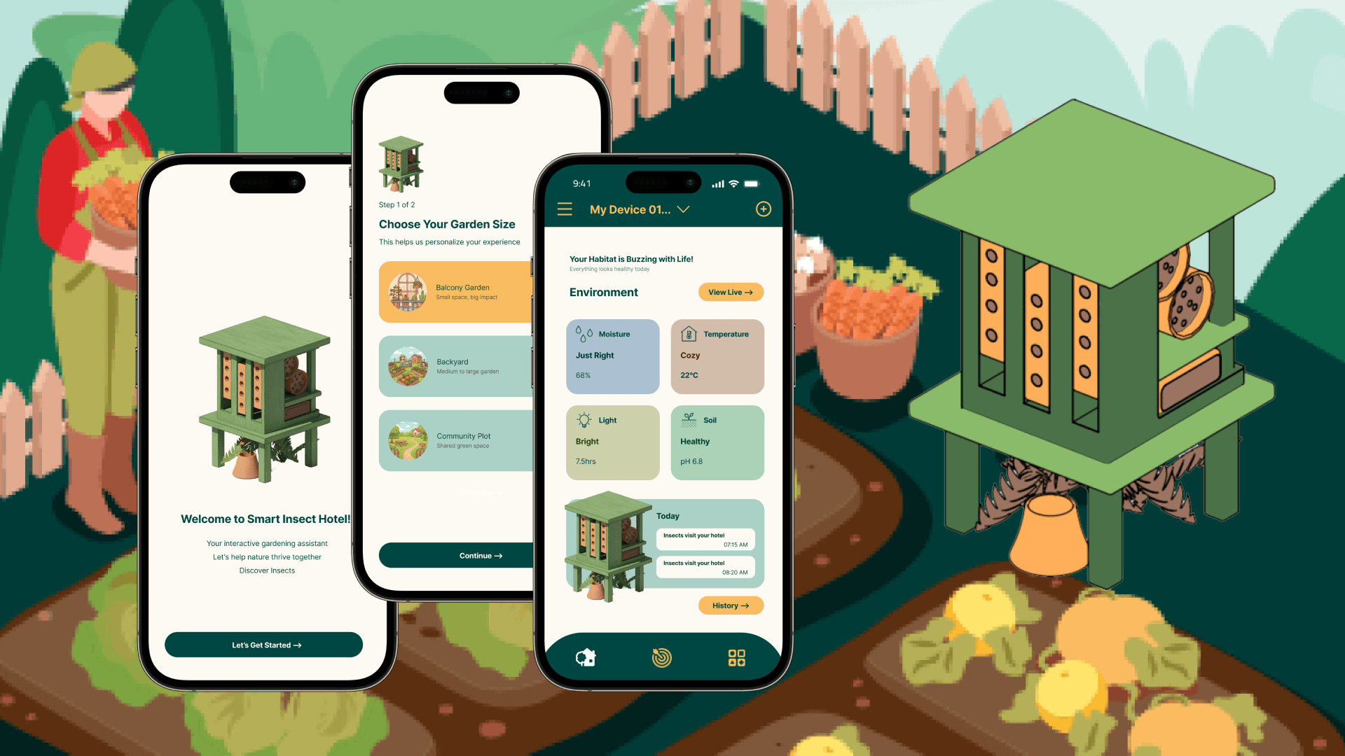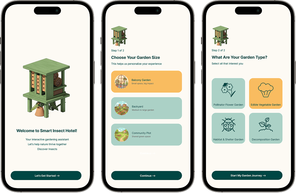 Through a short onboarding assessment, the system learns about the user’s garden size, type, and goals. Based on the results, Smart Insect Hotel recommends what kind of insect hotel structure and habitat setup is most suitable for attracting specific insect species. This helps users make informed ecological decisions from the beginning, rather than relying on guesswork or trial and error.