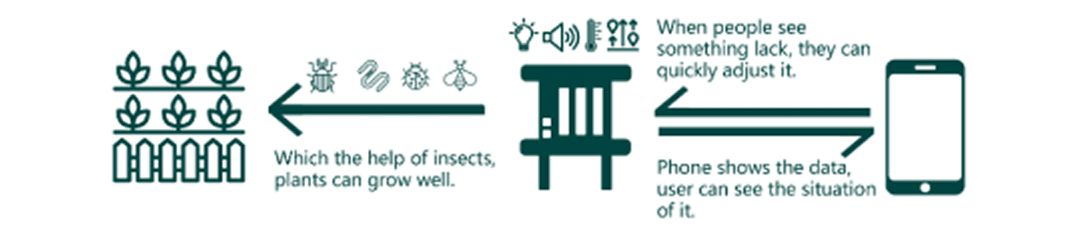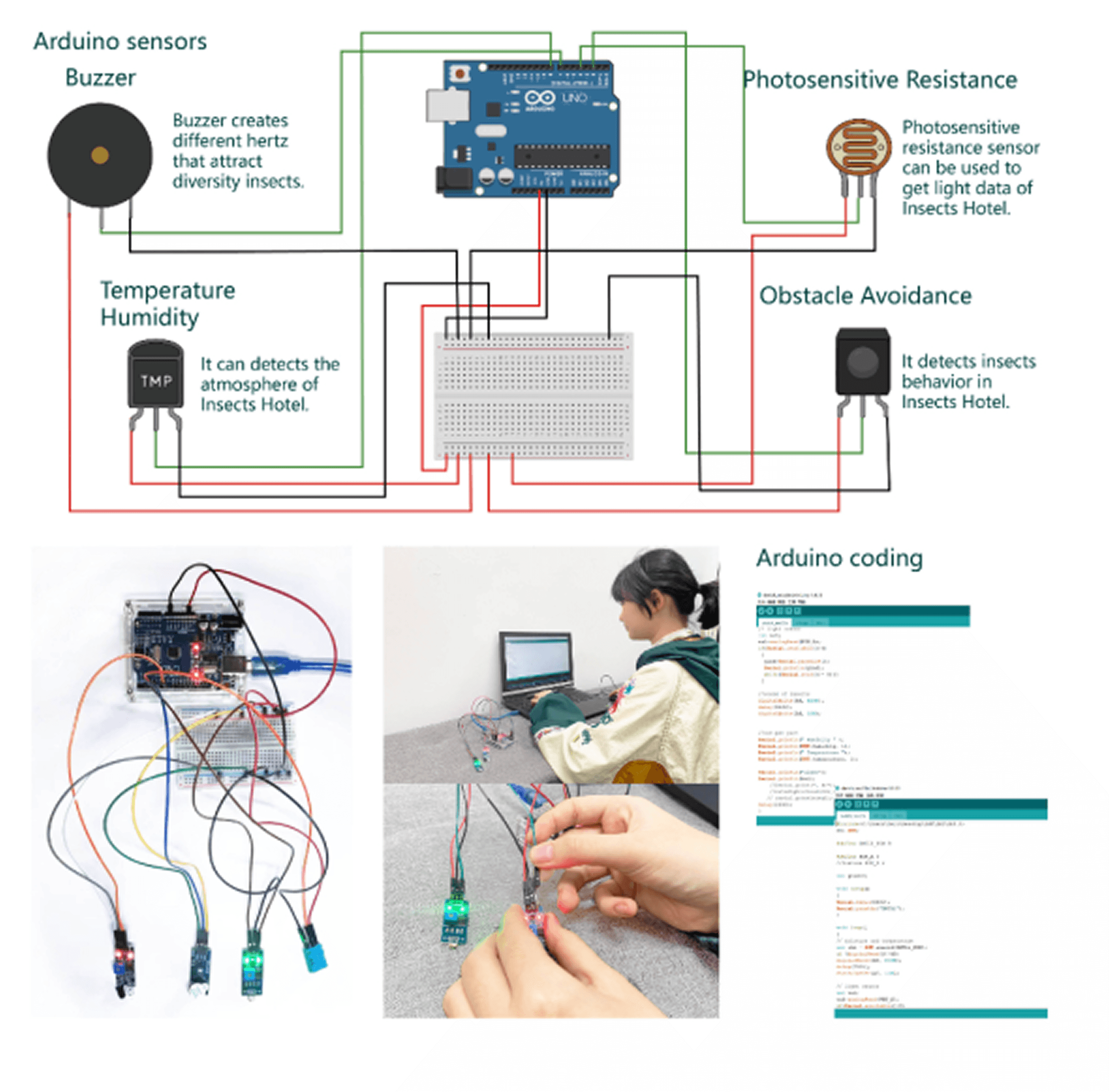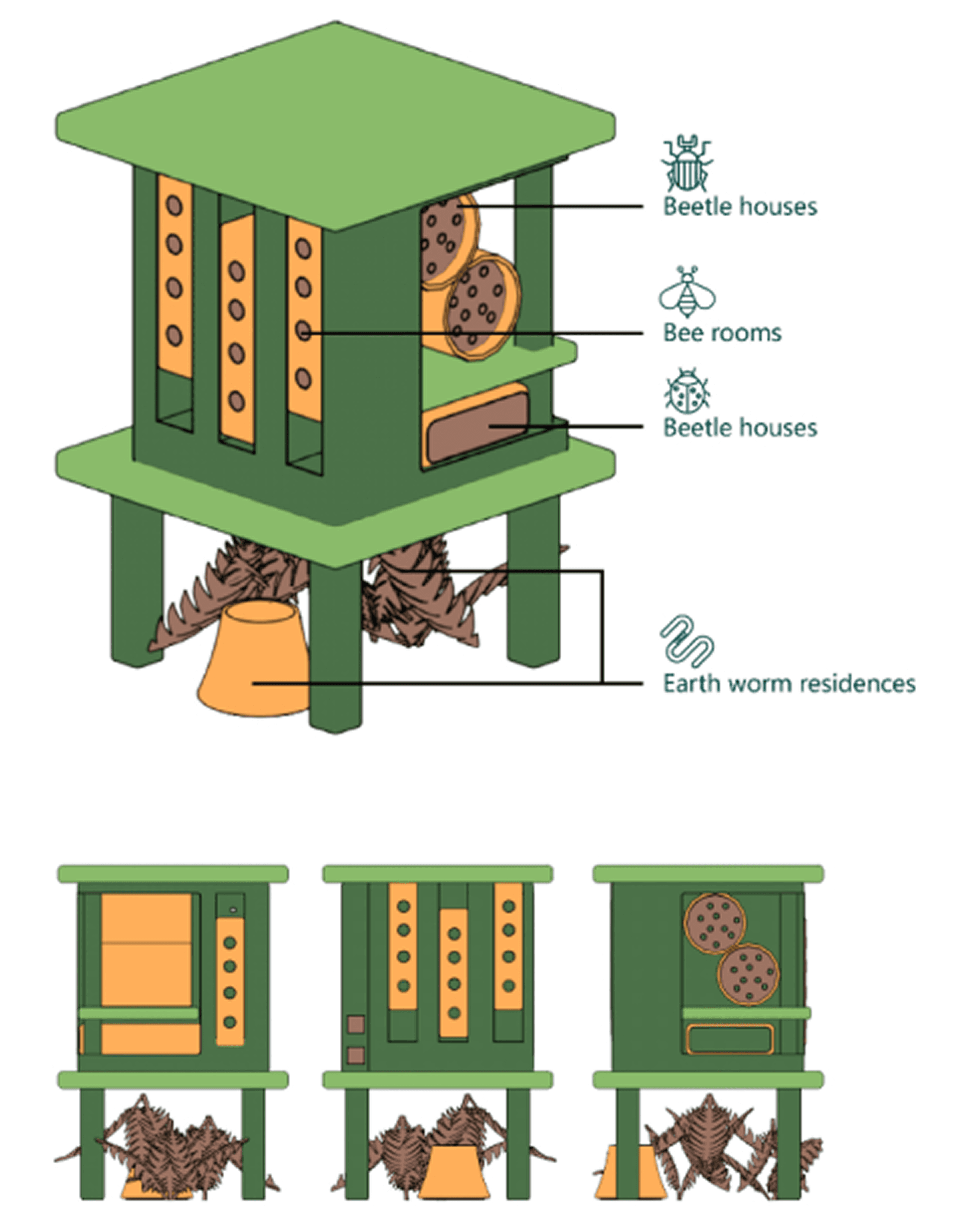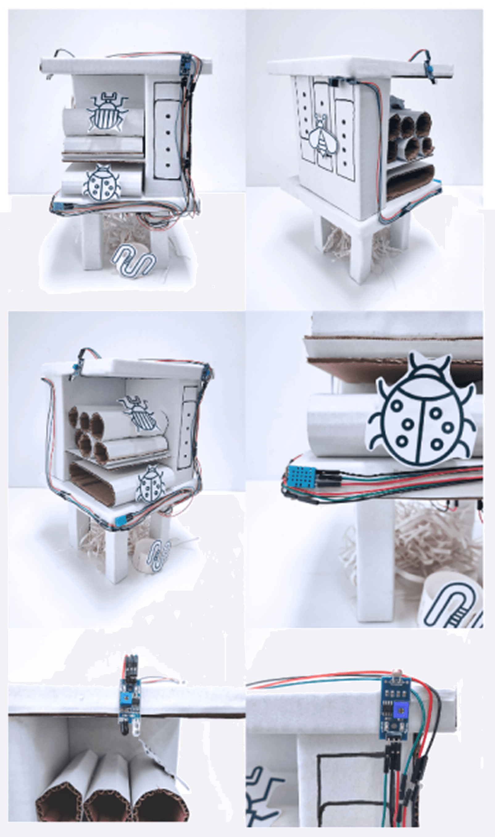 Insects Hotel is an Arduino-powered micro-habitat designed to support pollinators in home gardens. By sensing moisture, temperature, and light, it maintains suitable living conditions for insects and encourages people to care for their local ecology.