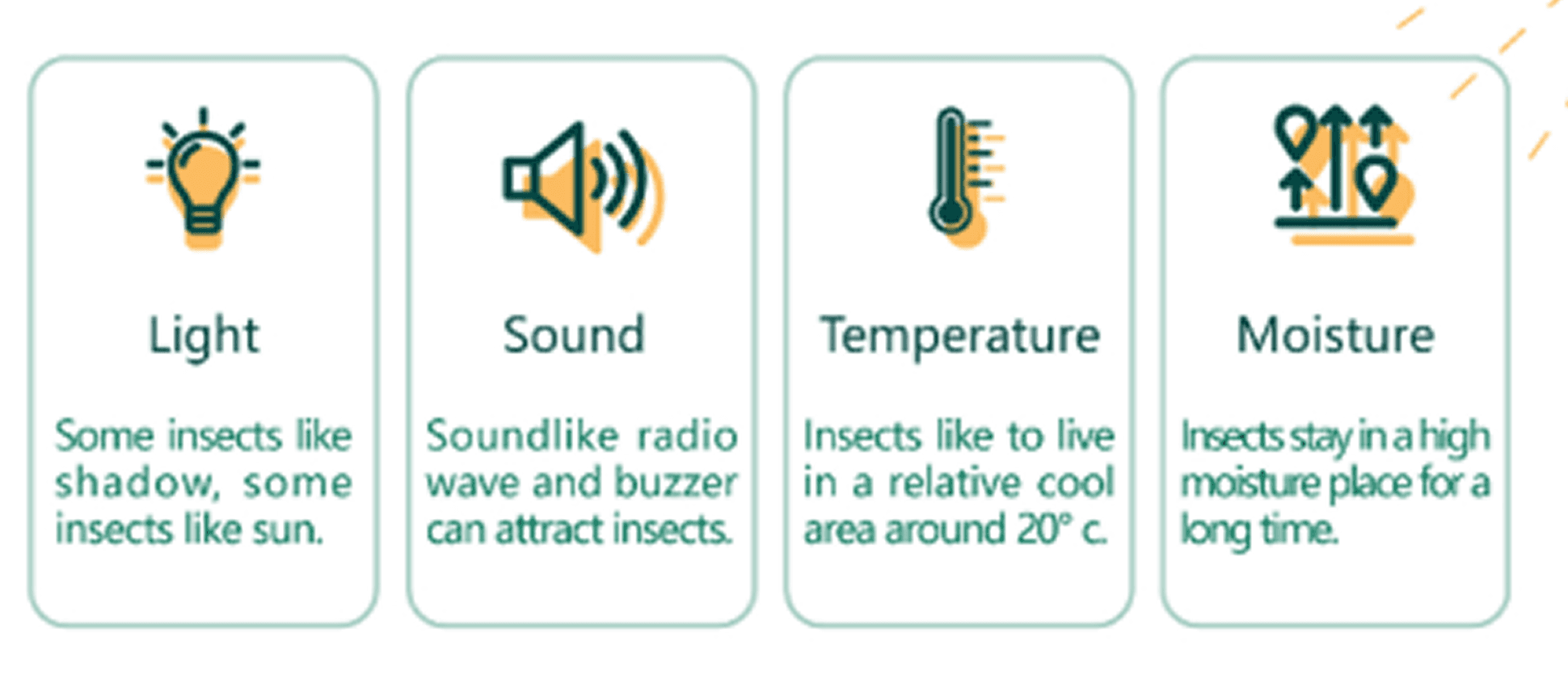 The homepage displays all adjustable environmental factors, including moisture, light, temperature, and habitat conditions. Users can tap into each parameter to make adjustments, and the interface immediately shows which insects are likely to be attracted under the current conditions. This allows users to clearly understand the cause-and-effect relationship between environmental changes and insect activity.