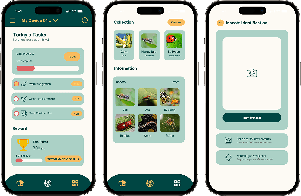 Daily tasks and a built-in insect knowledge base encourage users to gradually learn about insects through hands-on actions. The photo-based insect identification feature allows users to quickly identify insects they encounter in their garden, reducing uncertainty and fear. Users do not need prior biological knowledge to confidently recognize insects and understand their ecological roles.